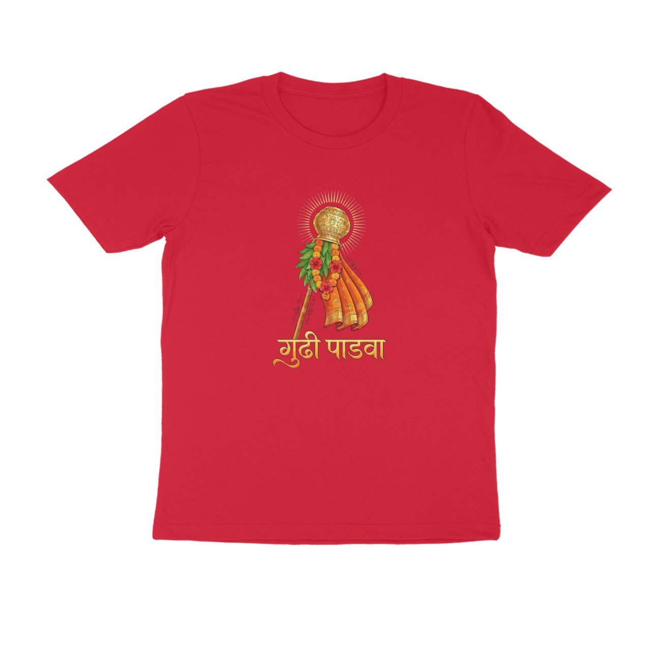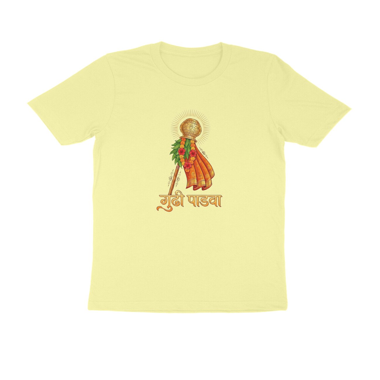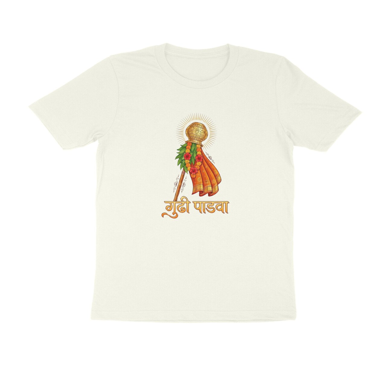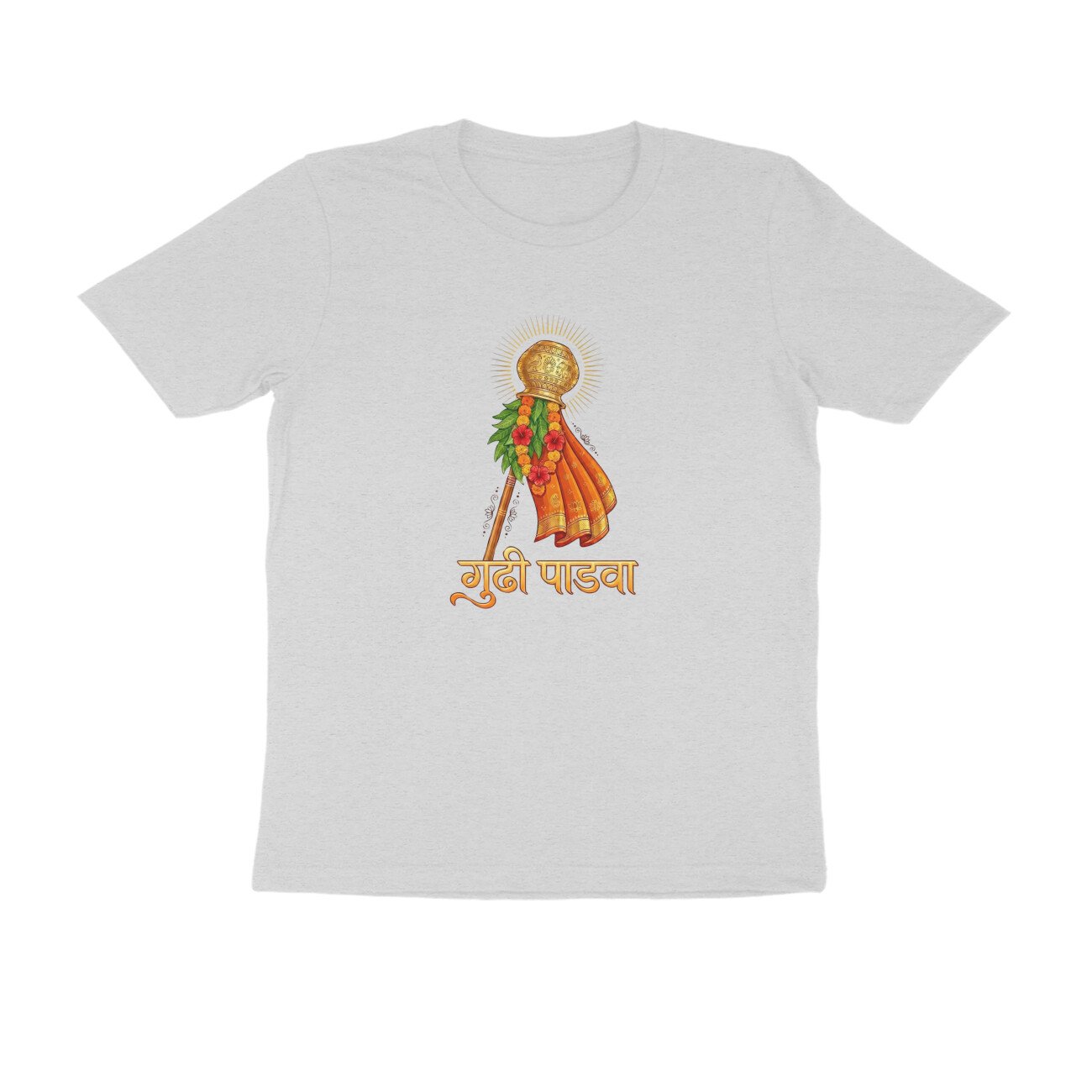 Made in India from high-quality, breathable pure cotton, this regular-fit T-shirt features a bold front print only depicting the iconic Gudhi flag, symbolizing victory, prosperity, and spring renewal traditions. Unisex half-sleeve round-neck design ensures versatility across sizes S-XXL; pre-shrunk and colorfast for long-lasting wear. Ideal for festival enthusiasts seeking authentic, ethically produced apparel that blends Hindu traditions with modern style.