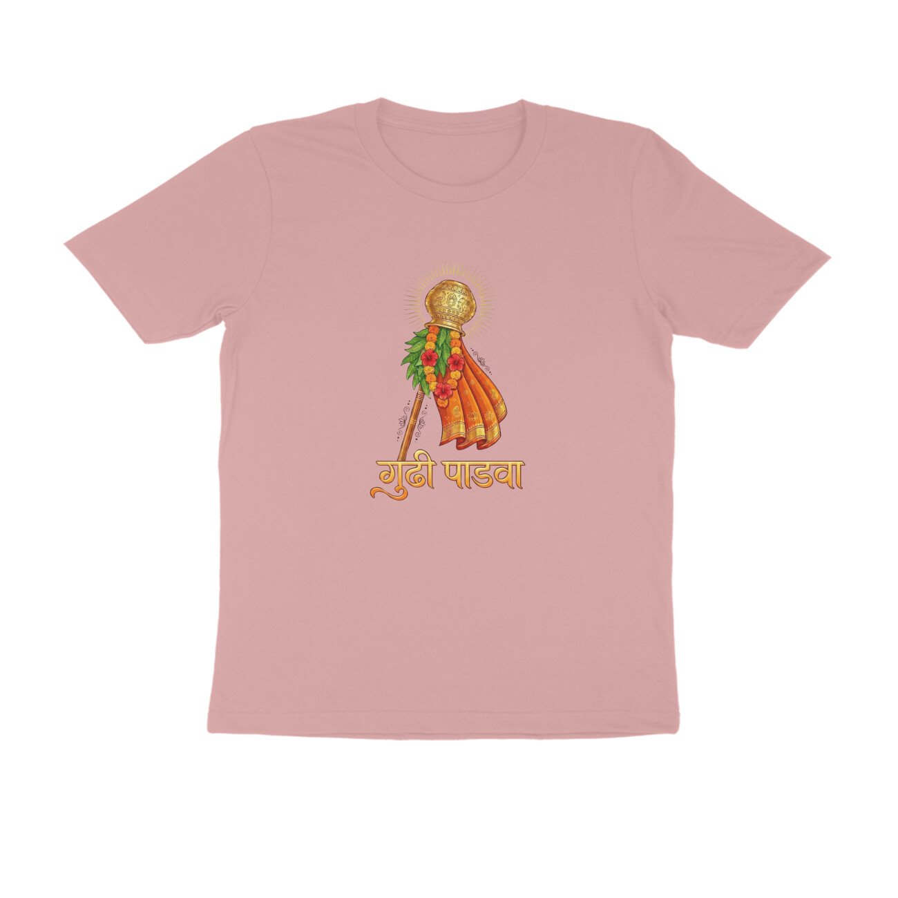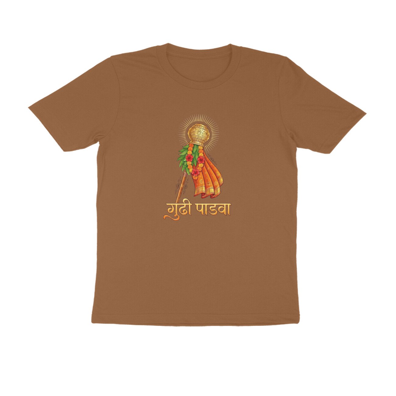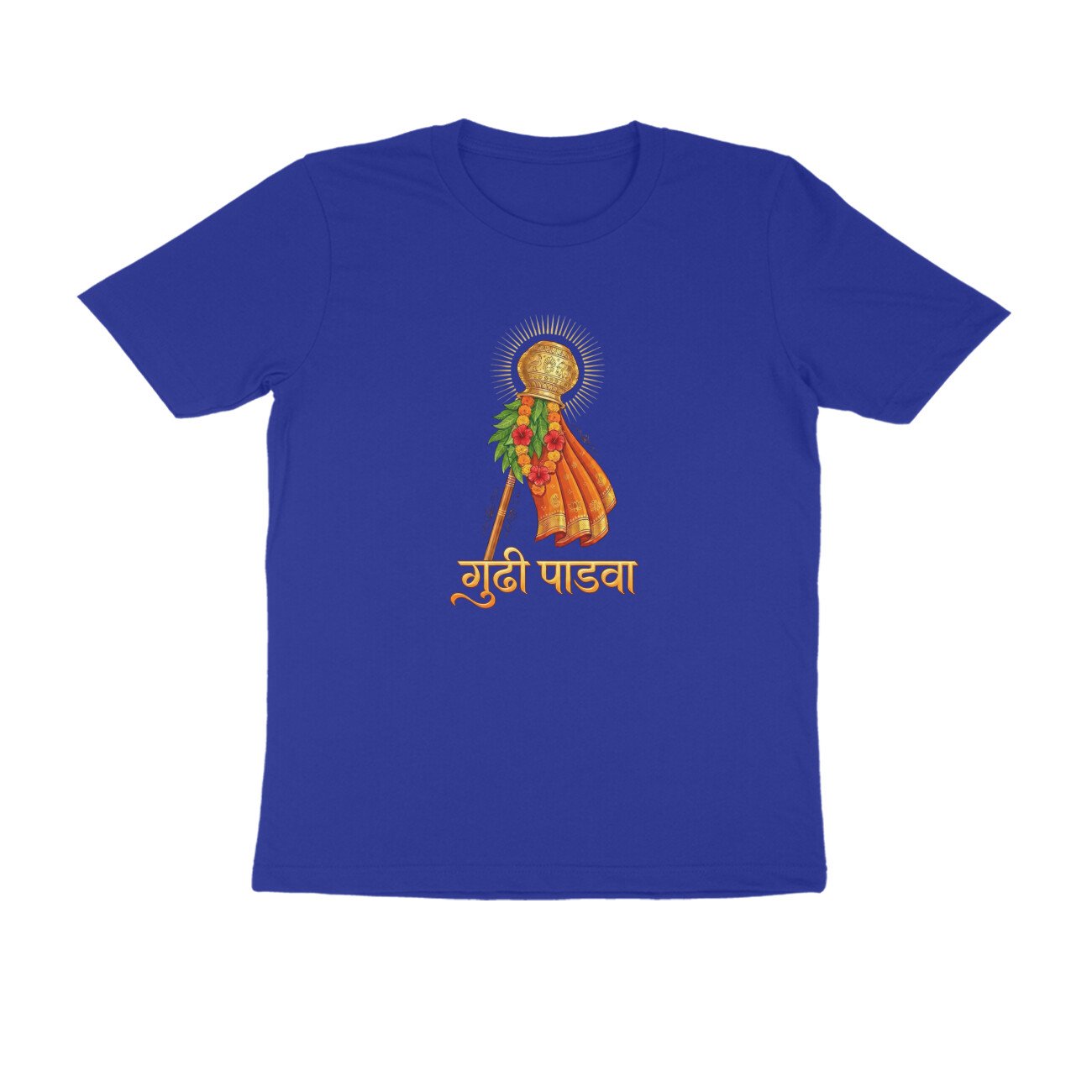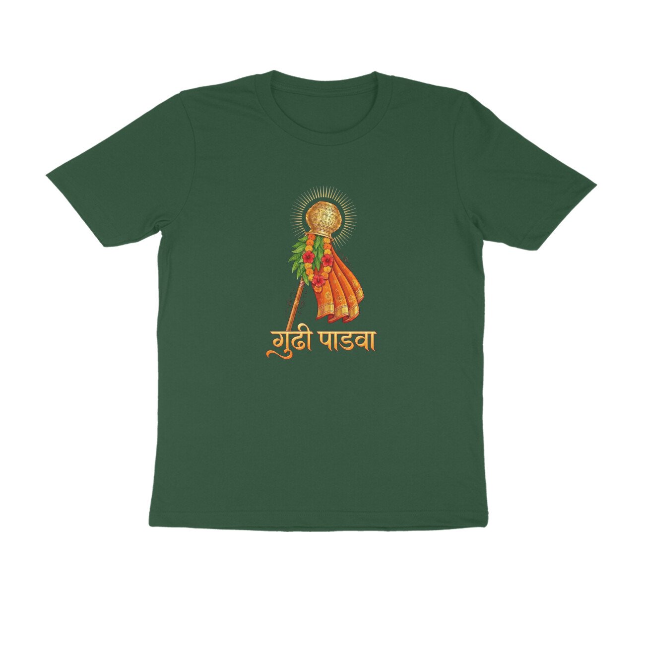 Made in India from high-quality, breathable pure cotton, this regular-fit T-shirt features a bold front print only depicting the iconic Gudhi flag, symbolizing victory, prosperity, and spring renewal traditions. Unisex half-sleeve round-neck design ensures versatility across sizes S-XXL; pre-shrunk and colorfast for long-lasting wear. Ideal for festival enthusiasts seeking authentic, ethically produced apparel that blends Hindu traditions with modern style.