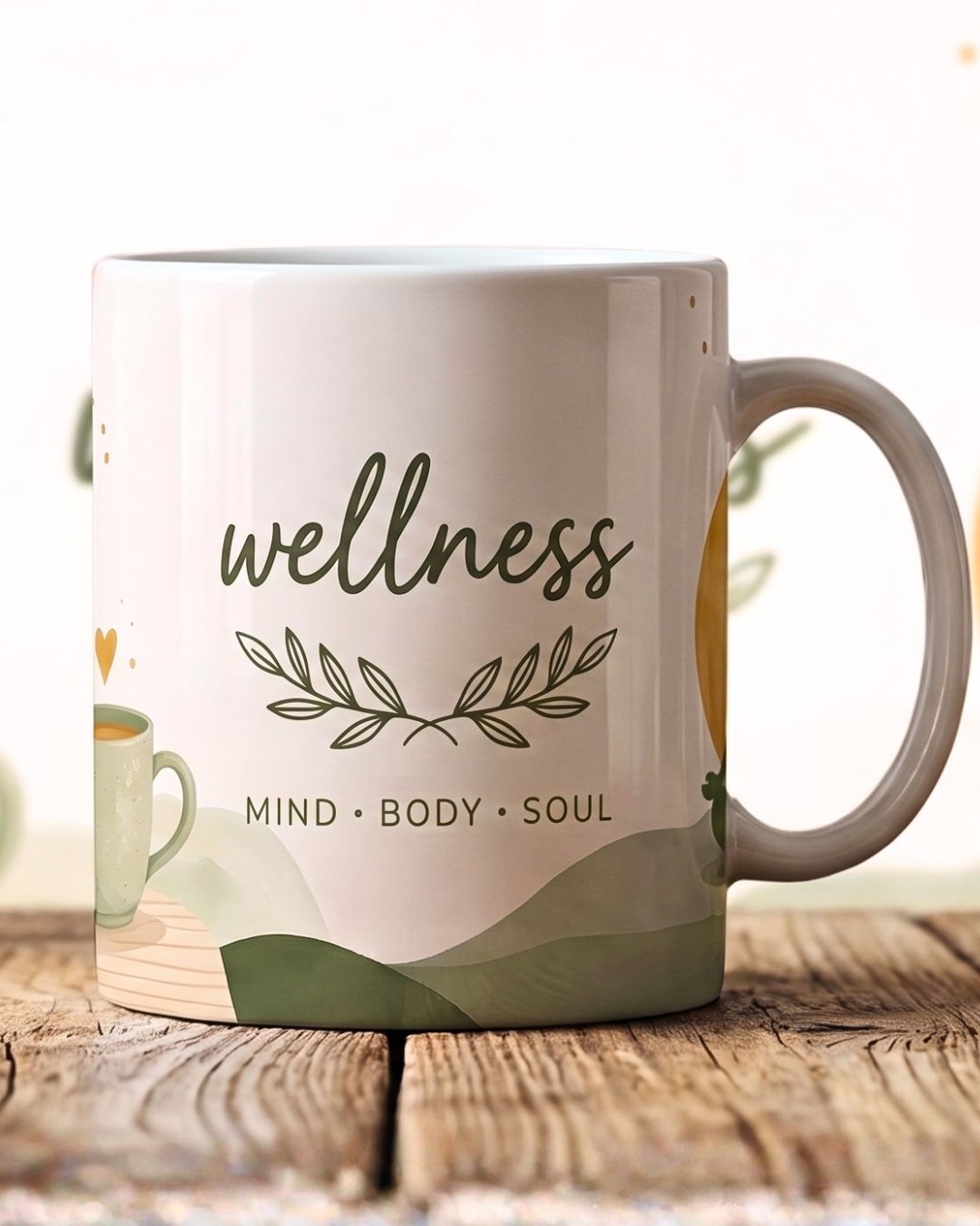 Cultivate complete wellbeing with our Wellness Balance Mug, showcasing minimalist illustrations of balanced chakras, healing herbs, and flowing energy waves in soft earthy tones. Drawing from ayurvedic principles and sanatan dharma wisdom, it transforms every sip of tulsi kadha or green matcha into a self-care ritual promoting vitality, clarity, and inner peace.